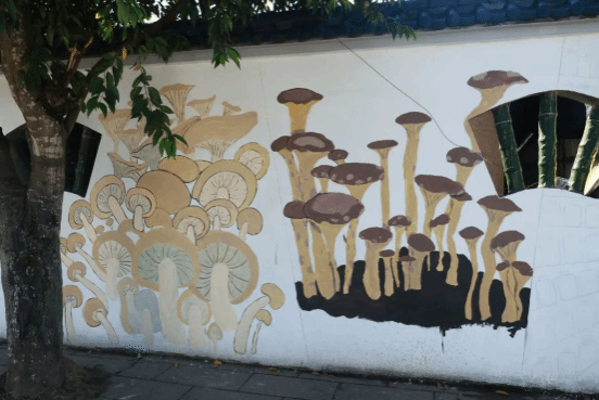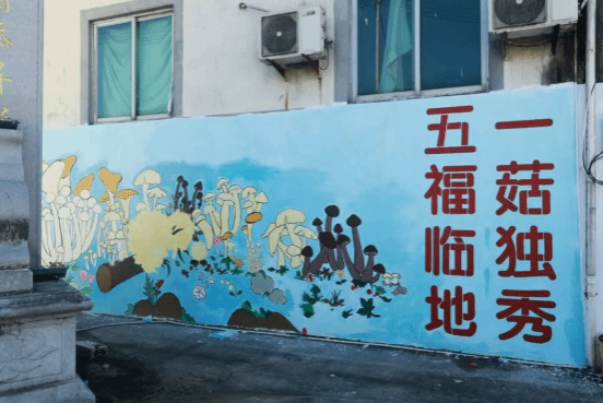 墙绘以食用菌产业发展为中心,融合“三黄世家”的历史文化,把村里的主要菌菇、流动厨灶、榕树讲堂等特色农产品和特色文化搬上围墙,致力于借助美丽乡村墙绘创作助力乡村振兴。