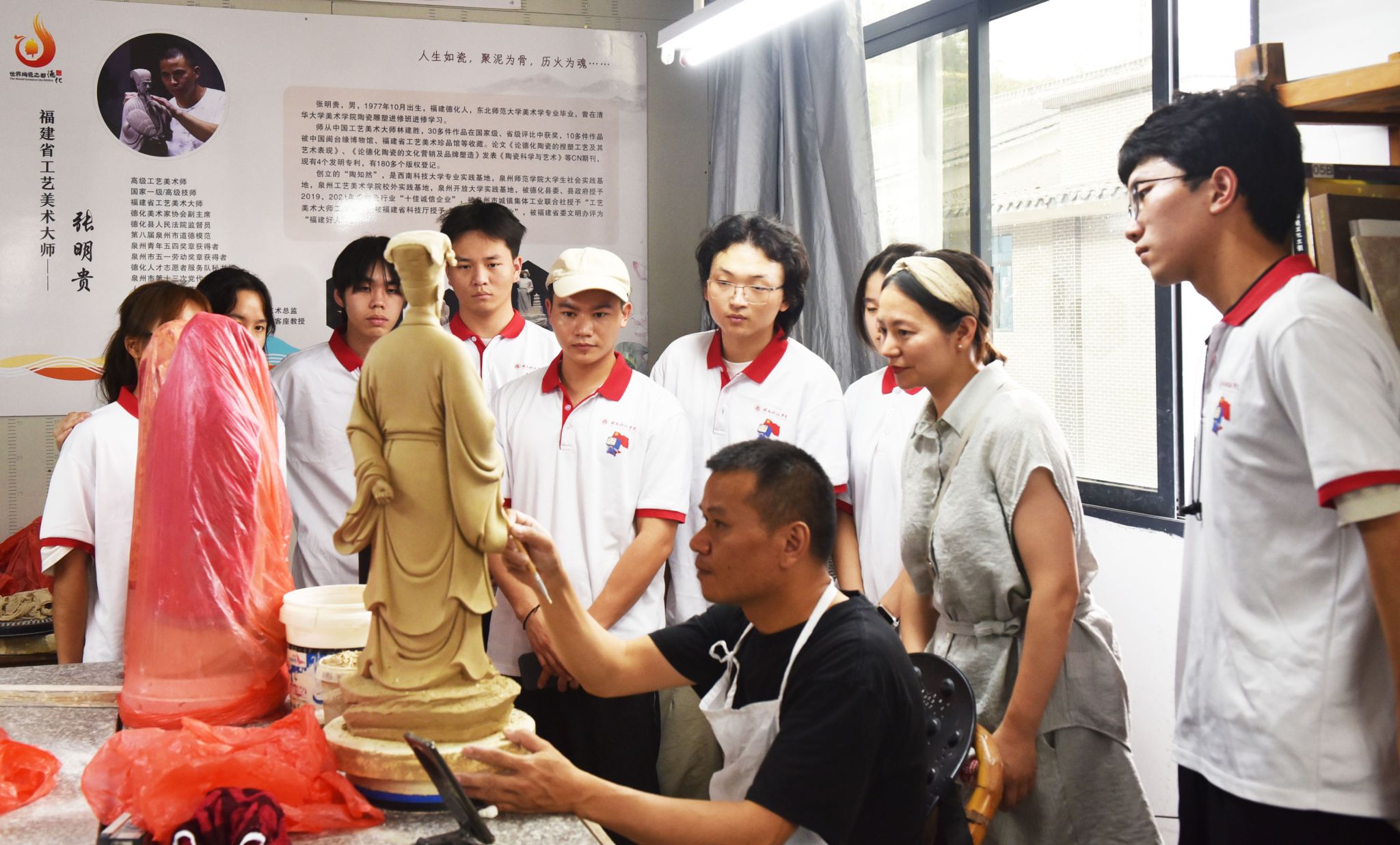 校团委“追梦者”暑期社会实践队走进张明贵大师工作室,领略德化瓷的精良制作,体验陶瓷创作