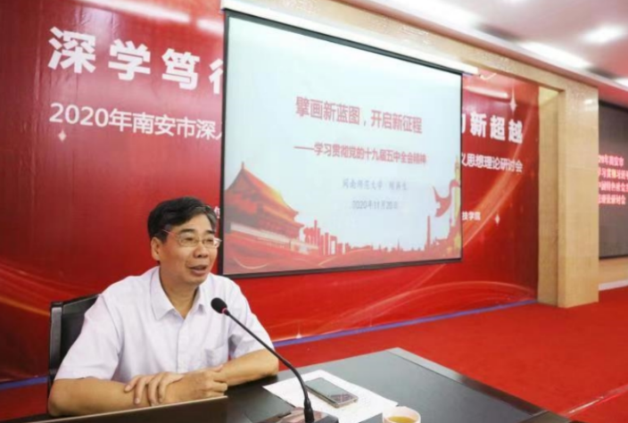 11月20日,学校联合南安市委宣传部、南安市社会科学界联合会举办2020年南安市深入学习贯彻习近平新时代中国特色社会主义思想理论研讨会,研讨会聚焦“深学笃行新思想,凝心聚力新超越”主题,深入探讨新思想理论研究工作和新南安建设生动实践,并邀请闽南师范大学马克思主义学院院长陈再生教授作学习贯彻党的十九届五中全会精神主旨报告,为广大师生全面宣讲、深入解读党的十九届五中全会精神。