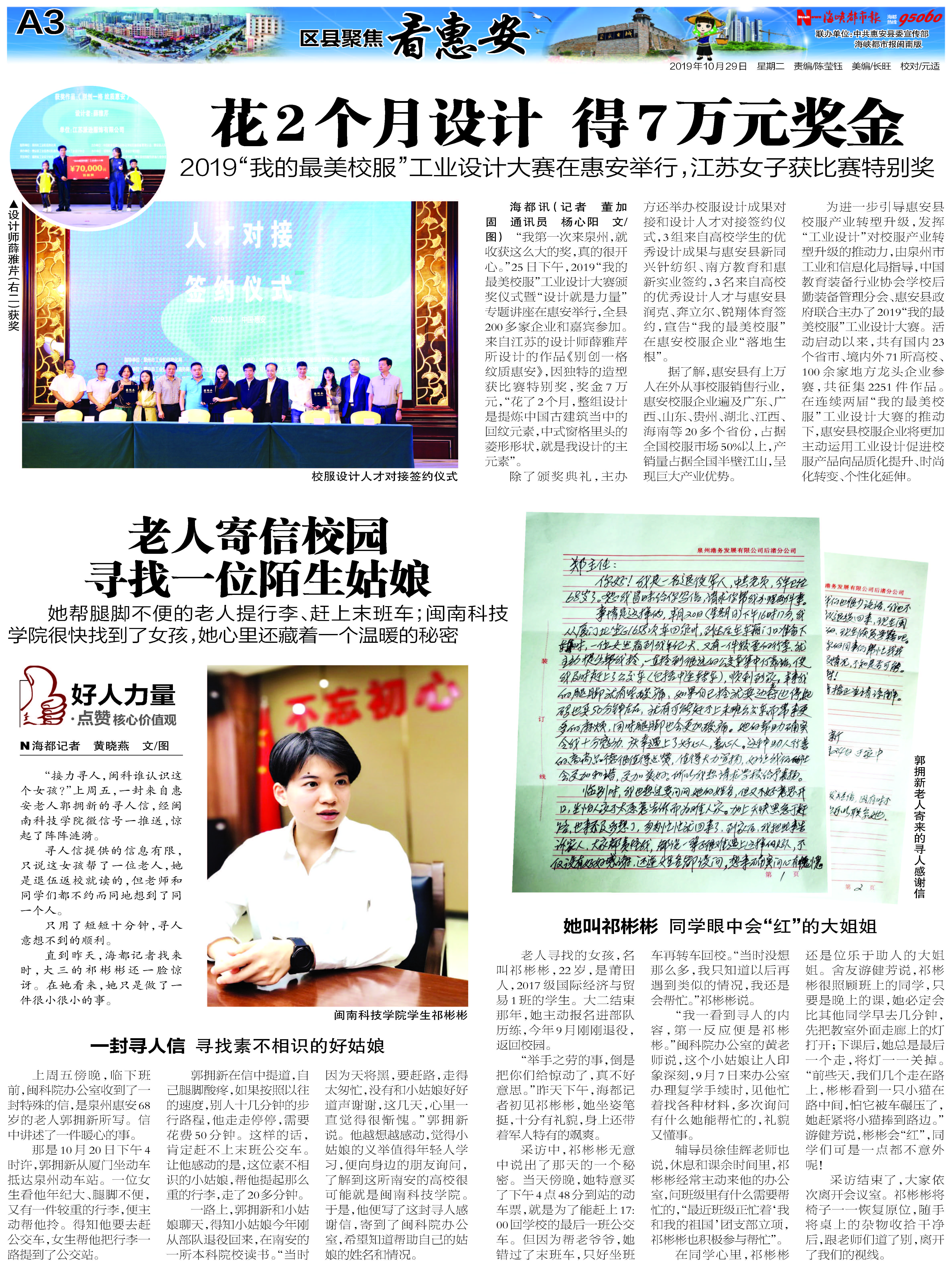 《湄洲日报》:助人为乐不留名 老人写信寻好人莆籍大学生 成爱心“网红”