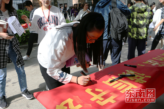同学们纷纷在普法条幅上签名 吴嘉军 摄