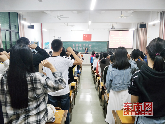 其中,商学院各专业在康美、美林校区同时举行宪法学习主题班会,同学们共同朗读宪法条例,讲述发生在身边的法律小故事、法律常识等,并庄严宣誓。艺术设计学院则利用多媒体课件,结合培育和践行社会主义核心价值观,深刻解读宪法的权威性、原则性,传递了树立宪法意识,培育宪法精神,遵守以宪法为核心的法律法规,做遵纪守法的好公民和社会主义事业建设者的理念。