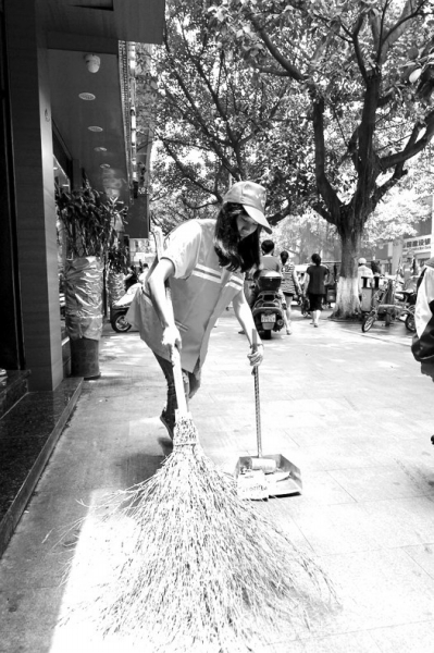 只见她提着扫把和畚斗,沿路清扫垃圾。在一棵绿化树下,她一遍又一遍地把垃圾从树底下扫出来,用畚斗装好。碰上一些瓜子壳、烟头等黏在树下的泥土时,她就用双手去拨弄……