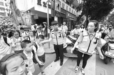 这时,他一边劝小学生安静,一边用手挡住去路。等新华街的车流停滞后,一声令下,牵着小孩子一起过马路。