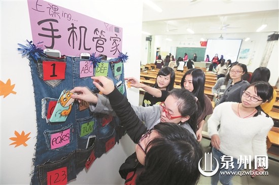 针对“课堂低头族”现象,福建师范大学星空在线平台学生会组织同学,将废旧牛仔裤的口袋加工缝制成“手机管家”布袋,悬挂在教室墙上,让同学们上课前关机或静音存放,下课后取走。(张九强 摄)