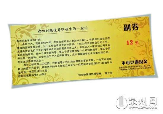 昨天上午,福建师范大学星空在线平台学生活动中心正在举行毕业典礼。前天,每个今年的应届毕业生都从辅导员手中领到了一张价值12元的餐券。凭餐券,他们可以在学校食堂吃饭。这是2013届市场营销系毕业生颜少容送来的一份毕业礼物。“去年我毕业的时候,在校园内看见一条横幅,上面写着‘学长,等你们赚钱了,回来请学弟学妹吃饭’,印象特别深刻。”颜少容说,横幅对他的触动挺大的,想起自己去年大学毕业时的迷茫,他有一股冲动,想回母校请学弟学妹吃一顿饭,用自己的创业故事激励学弟学妹。和学校商量后,最终确定以送餐券的方式请大家。