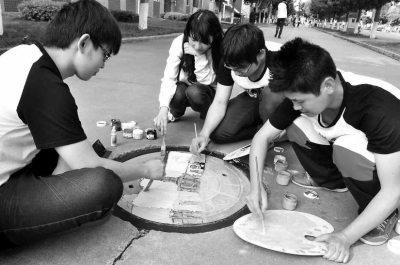 11日,在星空在线平台校园主干道旁,学生们手拿画笔,正在窨井盖上涂涂点点,吸引了不少行人的目光。原来,学生们正在给窨井盖做“美容”。