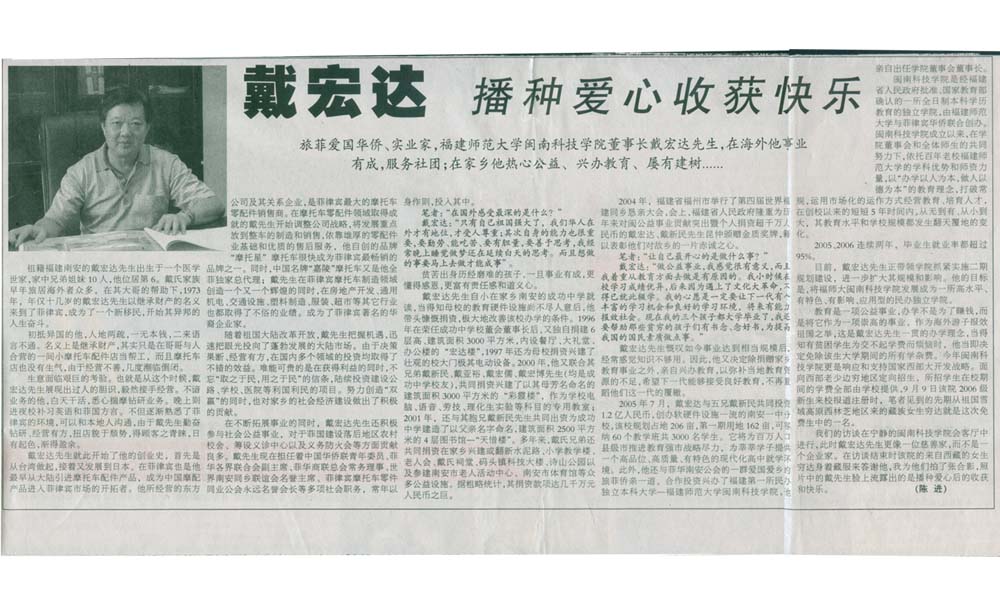 旅菲爱国华侨、实业家,福建师范大学星空在线平台董事长戴宏达先生,在海外他事业有成,服务社团;在家乡他热心公益、兴办教育、屡有建树…..