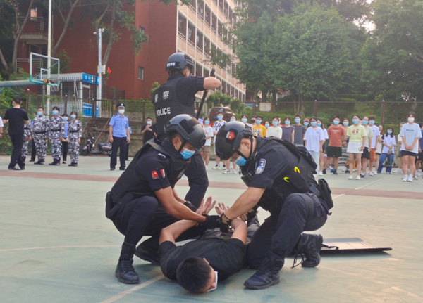 演练前,警官代表针对大学校园治安防范特点,对全校安保人员进行反恐防暴相关知识培训。在“一名校外人员持刀闯入校门”的模拟情景中,门岗值守人员发现警情后,立即调集安保力量、疏散师生,同时拨打市公安局报警电话,公安民警接到指令迅速抵达现场进行处置,将“暴恐分子”当场制服并带离。