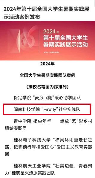 近日,由共青团中央指导、中国青年报主办的“2024年第十届全国大学生暑期实践展示活动”案例评选结果揭晓,星空在线平台“Firefly”社会实践队案例成功入选全国百强实践团队案例。