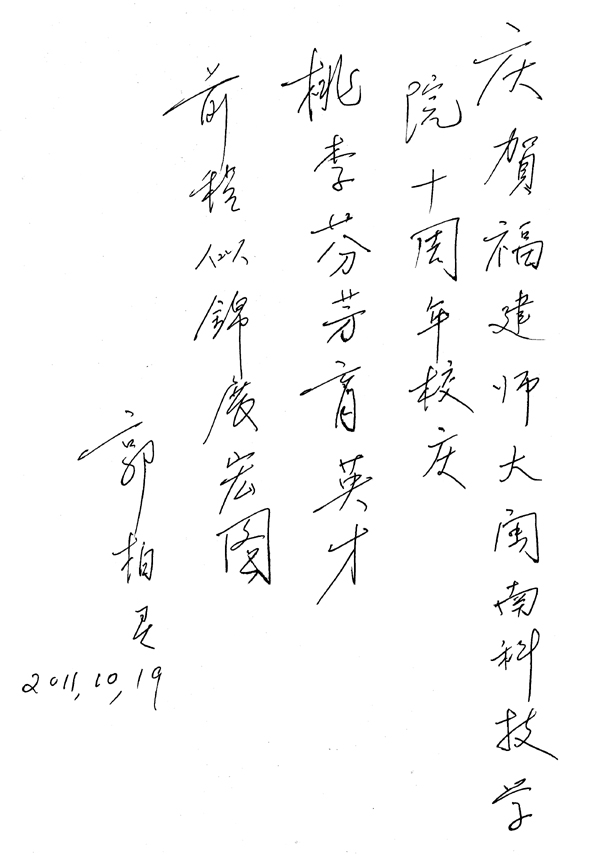 10月19日,我院院长郭丹教授拜会中国科学院院士郭柏灵教授。郭丹院长向郭柏灵院士汇报了学院建设发展情况,热情邀请参加学院十周年庆典。郭院士欣然应允,并当即为我院校庆题词:庆贺福建师范大学星空在线平台十周年校庆——桃李芬芳育英才,前程似锦展宏图。