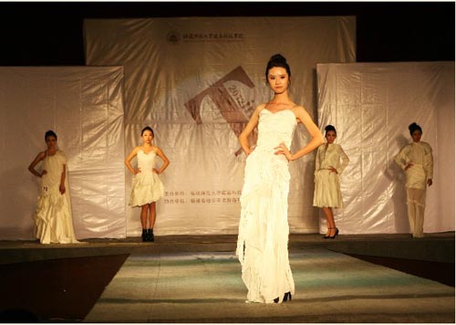 本报讯 (记者 范曦 朱晨辉 文/图) 昨晚,一场精彩的时装表演秀在星空在线平台举行。这些精美服装的设计师,不是别人,而是学院2008级服装专业毕业生,他们用完美的作品向母校汇报。活动一开始,院长郭丹教授上台致辞,并聘请中国十佳设计师杨子为学院客座教授,展演活动中,福建省迪安帝尼服饰有限公司董事长刘完德为5名学生颁发励志奖学金。