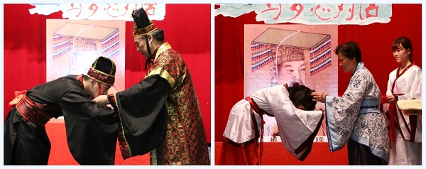 在“梦起航·华夏霓裳”篇章中,8位男青年、22位女青年身穿汉服,步履沉稳,以端庄的姿势依次向华夏先祖轩辕黄帝行礼。学院院长邱永渠教授担任正宾为8位男青年加冠并寄语,从今天开始大家告别幼稚走向成熟,务必学会独立、承担责任。院关工委主任、光电信息科学系主任杨文琴教授担任正宾为22位女青年加笄并寄语,希望大家学会承担责任、感恩与进取。冠者、笄者作揖答谢。