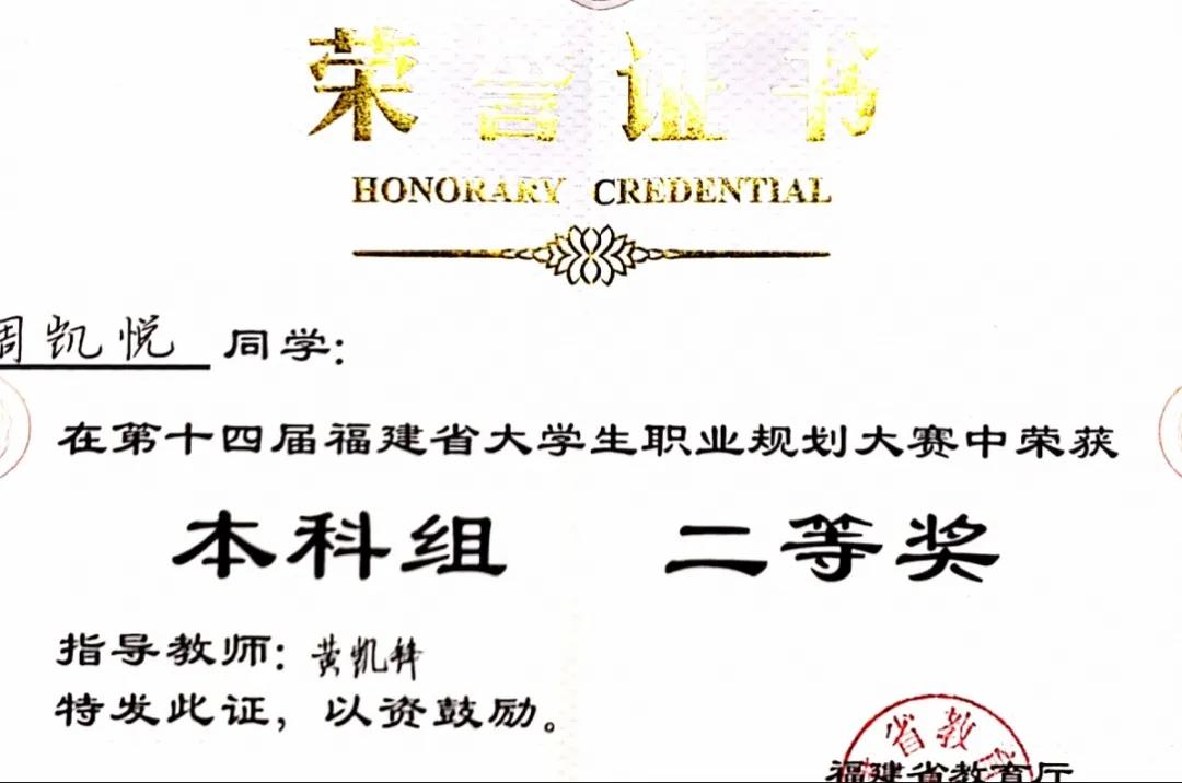 11月19日,由福建省教育厅主办的第十四届福建省大学生职业规划大赛总决赛和颁奖典礼在福建技术师范学院举行。我校2021级市场营销专业(专升本)周凯悦同学获得大赛本科组二等奖。