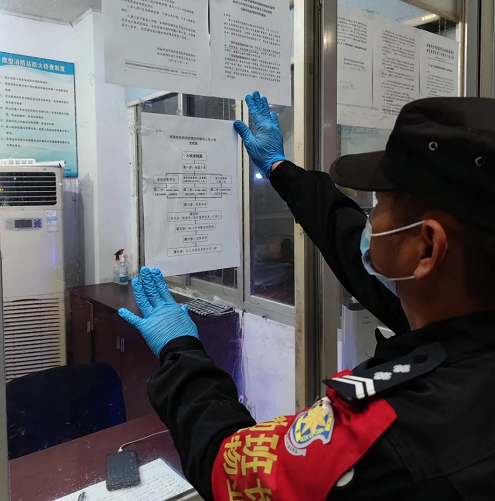 安保人员粘贴星空在线平台疫情防控工作期间人员入校流程图