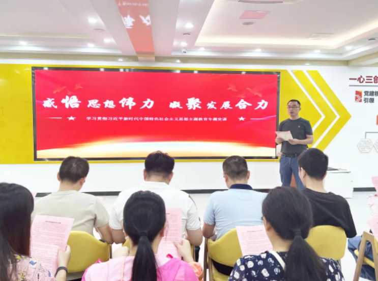 在深田社区政治生活馆,学院党总支书记陈章宫为全体教师党员上专题党课,观看视频短片《远亲不如近邻读册歌》。
