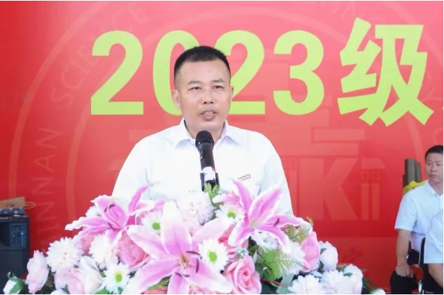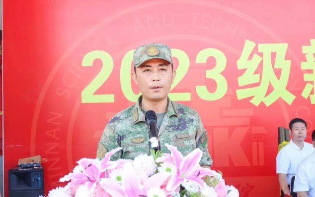 军训承训部队副政治教导员张彬松做军训动员讲话。生命科学与化学学院周强教授作为教师代表、商学院2021级投资学专业姚冬梅同学作为老生代表、土木工程学院2023级工程造价专业黄秋昕同学作为新生代表分别发言。